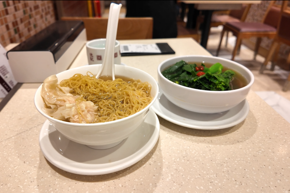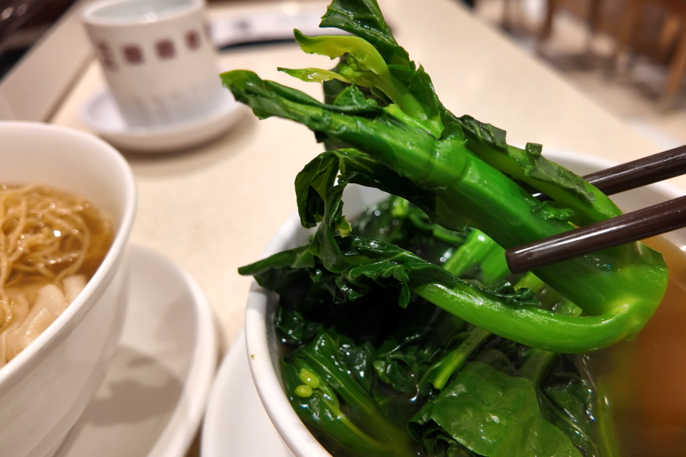 海老ワンタン麺はどこのお店で食べても美味しさは変わらない印象。ここのもとても美味しい。チャイニーズケールは太くて食べ応えあり。むしゃむしゃ食べる感じ。これも美味しい、しかも緑が濃くて体に良さそう。