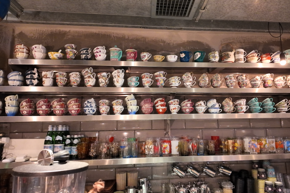 お洒落な香港らしい色とりどりの食器がずらりと並ぶ。ラッキーなことに目の前の席に案内してもらえた。